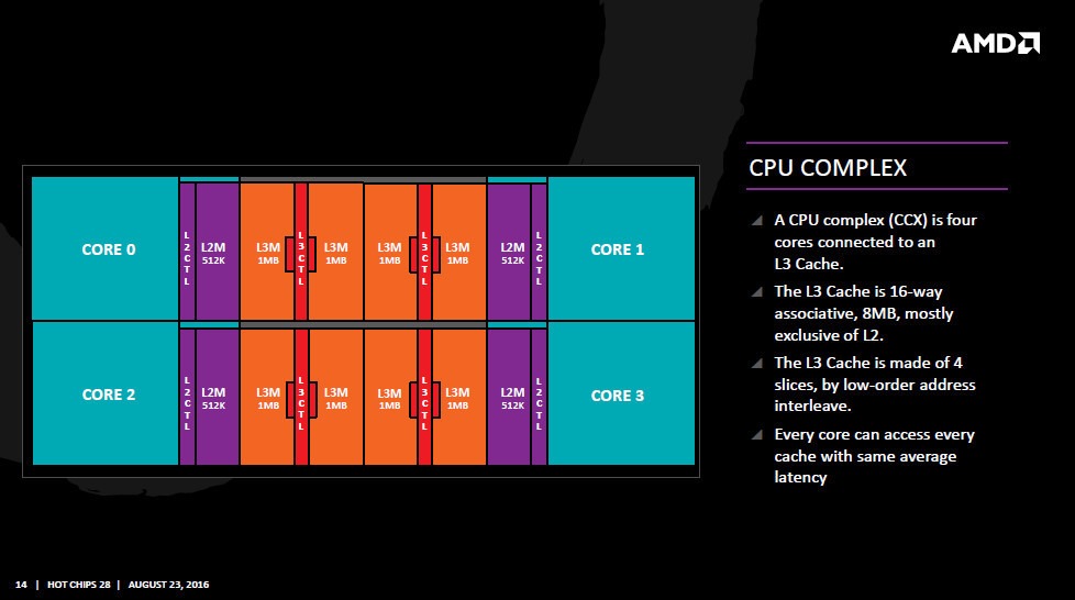 طبق اطلاعات منتشر شده توسط AMD، پردازنده های 7 نانومتری این شرکت از چهار بلوک پردازشی بهره می برد که هر بلوک می تواند هشت هسته پردازشی را مدیریت کند. همچنین ارتباط میان هسته های پردازشی و حافظه L3 Cache توسط 16 مسیر پوشش داده می شود. برای کاهش زمان تاخیر در برقراری ارتباط میان هسته های پردازنده و حافظه نهان، حافظه L3 Cache به 4 بخش تقسیم می شود تا هر بلوک یا مجموعه پردازنده CCX به صورت مستقیم با یک واحد از Cache لینک شود.
