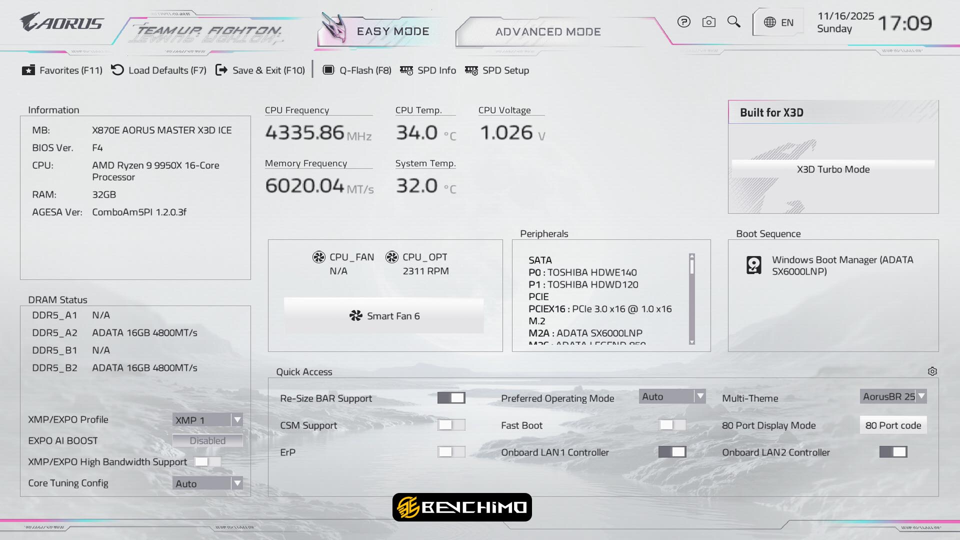 باید عنوان کرد که این مادربرد یعنی X870E AORUS MASTER X3D ICE به دلیل ساختار رده بالا، مدار رگولاتور قدرتمند و دمای بهینه تر در بخش VRM، عملکرد بهتری با پردازنده 9950X دارد اما نباید فراموش کرد که یکی از مهمترین ویژگی های این مادربرد قابلیت X3D Turbo Mode 2.0 است. قابلیتی که همانند اسمش برای پردازنده های X3D است. ویژگیهای ممتازی مانند X3D Turbo Mode 2.0 یا AI-Tuning اختصاصی X3D، برای پردازندههای غیر X3D چندان ملموس نیست یا تفاوت کم است، پس بهتر است برویم به سراغ یکی از بهترینهای این زمینه یعنی 9950X3D تا قدرت این مادربرد با قابلیتهای مختلفش را بسنجیم.